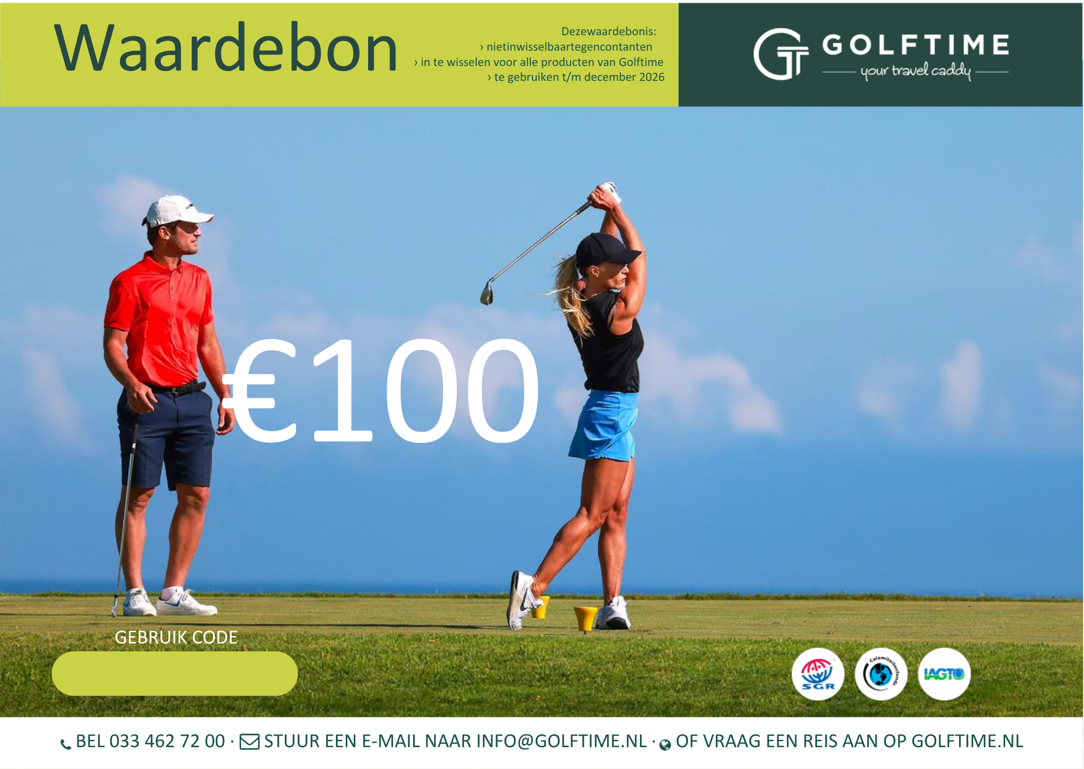 Voor iedere gelegenheid kun je bij Golftime een gepersonaliseerde waardebon laten samenstellen. Je bepaalt zelf de waarde, terwijl de ontvanger kan kiezen uit meer dan 20 golfbestemmingen. Zo geef je niet zomaar een cadeau, maar een complete golfervaring. Het tegoed is één jaar geldig en te besteden op alle golfreizen en aanbiedingen op de website van Golftime. Hierdoor heeft de ontvanger alle vrijheid om zijn of haar ideale golfvakantie te kiezen.